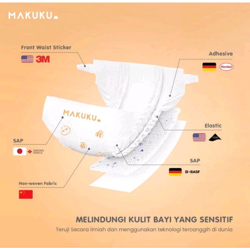 1. Anti Gumpal / Anti-clumping (With New Generation SAP Core Structure Pertama di Indonesia) SAP adalah polymer hidrophilik yang memiliki kemampuan dapat menyerap cairan hingga lebih dari 100x lipat dari berat SAP sendiri. Penyerapan merata dan strukturnya sangat stabil sehingga tidak menggumpal dan jatuh, membuat bayi tidak merasa berat saat bergerak. Dengan adanya bahan SAP ini maka terdapat 3 manfaat dari Popok MAKUKU : - Tidak Menggumpal, sehingga membuat bayi lebih nyaman - Penyerapan Merata, sehingga mengurangi kebocoran - Daya serap yang tinggi dan cepat, sehingga menjaga permukaan tetap kering dan mampu secara efektif mengurangi ruam merah pada kulit bayi.