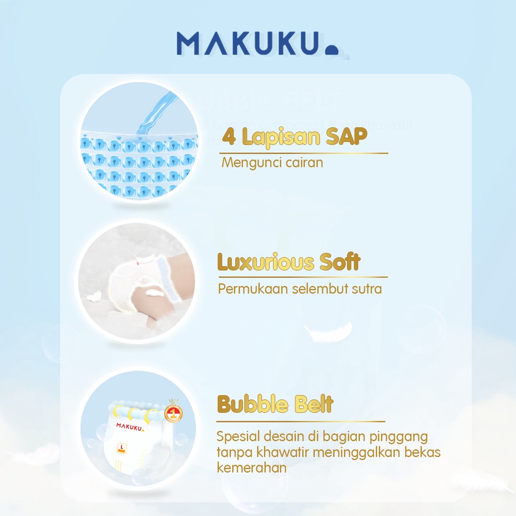 Popok New Generation SAP Core Structure Pertama di Indonesia, popok generasi terbaru dengan struktur yang stabil membuat popok Makuku tidak mudah menggumpal dan jatuh, serta membuat bayi tidak merasa berat saat bergerak. Penyerapan kecepatan tinggi membuat SAP yang masuk ke popok akan cepat diserap merata sehingga dapat melindungi pantat bayi dari iritasi.