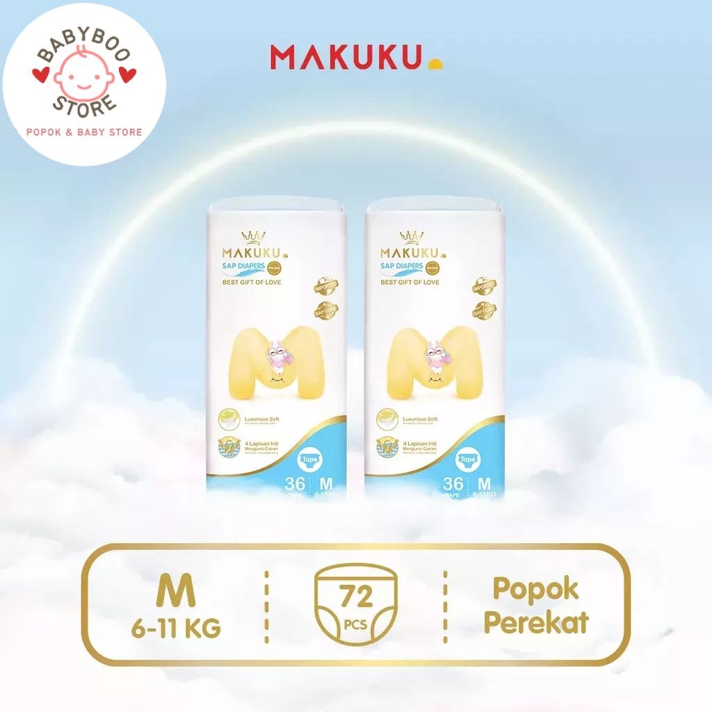 Detail produk: Brand : MAKUKU Series : MAKUKU PROCARE Tipe popok : Tape / Perekat Ukuran: M Isi: 2 Pack x 36 pcs