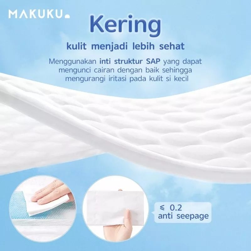1. Anti Gumpal / Anti-clumping (With New Generation SAP Core Structure Pertama di Indonesia) SAP adalah polymer hidrophilik yang memiliki kemampuan dapat menyerap cairan hingga lebih dari 100x lipat dari berat SAP sendiri. Penyerapan merata dan strukturnya sangat stabil sehingga tidak menggumpal dan jatuh, membuat bayi tidak merasa berat saat bergerak. Dengan adanya bahan SAP ini maka terdapat 3 manfaat dari Popok MAKUKU : - Tidak Menggumpal, sehingga membuat bayi lebih nyaman - Penyerapan Merata, sehingga mengurangi kebocoran - Daya serap yang tinggi dan cepat, sehingga menjaga permukaan tetap kering dan mampu secara efektif mengurangi ruam merah pada kulit bayi.