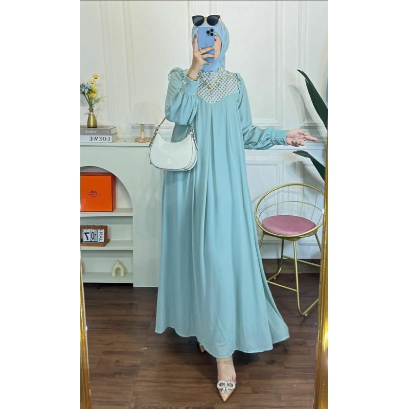 MALA DRESS CRINCLE AIRFLOW Bahan : crincle airflow Warna : biru,mint,hitam Ukuran : LD 120 cm Pj lengan 56 cm pj baju -+132 cm Detail : Ujung lengan kancing ada renda di lengan ada furing di dada Non busui kancing belakang