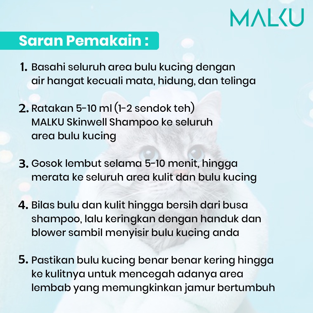 Rekomendasi penggunaan MALKU Skinwell Shampoo: 1. Basahi seluruh area bulu kucing dengan air hangat kecuali mata, hidung dan telinga. 2. Ratakan 5-10ml (1-2 sendok teh) MALKU Skinwell Shampoo ke seluruh area bulu kucing 3. Gosok lembut selama 5-10 menit, hingga merata ke seluruh area kulit dan bulu kucing 4. Bilas bulu dan kulit hingga bersih dari busa shampoo lalu keringkan dengan handuk dan blower sambli menyisir bulu kucing anda 5. Pastikan bulu kucing benar-benar kering hingga ke kulitnya untuk mencegah adanya area lembab yang memungkinkan jamur bertumbuh
