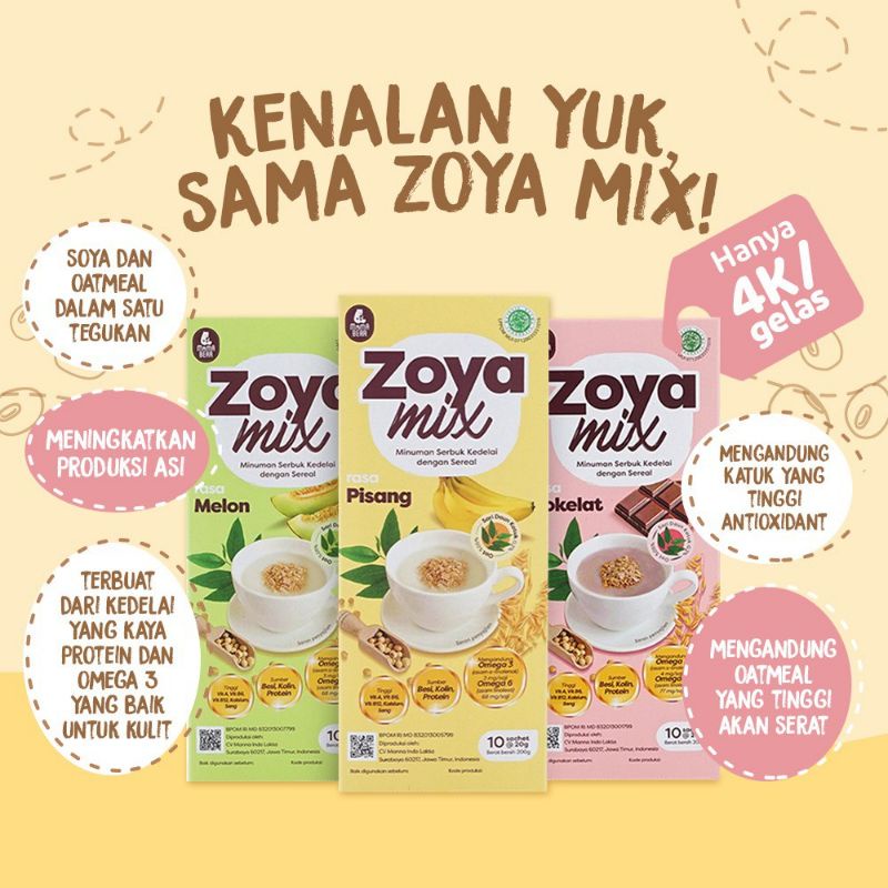 Zoya Mix adalah minuman bubuk dari bahan soya dan sereal oat yang sudah diperkaya dengan vitamin dan mineral. Dibuat dengan bahan alami, konsumsi Zoya Milk telah terbukti efektif membantu produksi ASI berlimpah. Produk ini aman untuk dewasa dan anak- anak dengan rasa lezat dan mengenyangkan. Tersedia dalam kemasan higienis dan 3 rasa pilihan.