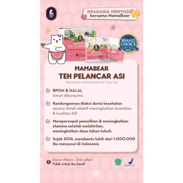 Terbuat 100% dari bahan- bahan alami pilihan, Teh Pelancar ASI Mamabear telah terbukti membantu produksi ASI untuk ibu menyusui. Rasa manis alami & aroma relaxing siap membantu Anda untuk semakin tenang dan percaya diri. Tersedia dalam kemasan teh seduh biodegradable dan bebas klorin, praktis untuk disajikan di rumah atau dimana saja!