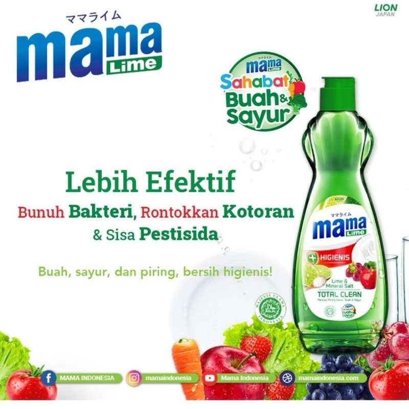 MAMA LIME Cairan pencuci piring, gelas, buah dan sayur dengan formula Total Clean, mengandung esktrak Lime, Mineral Salt dan Anti Bacteria. Formula Anti BACTERIAL FOOD GRADE (BIOGUARD) teruji klinis untuk jenis kuman S.Aurus. Efektif membersihkan sisa pestisida dan bakteri hingga 99%. Hasil bersih higienis dan kesat. KEUNGGULAN : Formula Anti Bacteria Food Grade, Kuman mati & higienis, Efektif bunuh kuman pada piring, gelas, buah dan sayur. membersihkan sisa pestisida yang menempel pada buah dan sayur, Lembut di tangan. Cara Penggunaan : 1. Tuang 1/2 sendok teh Mama Lime ke dalam mangkuk berisi 1 gelas air bersih 2. masukkan spons dalam larutan Mama Lime dan remas-remas hingga berbusa. 3.Cuci peralatan makan dan dapur, lalu bilas dengan air hingga bersih. 4. Untuk kotoran membandel, tuang langsung Mama Lime pada noda dan diamkan sebentar.