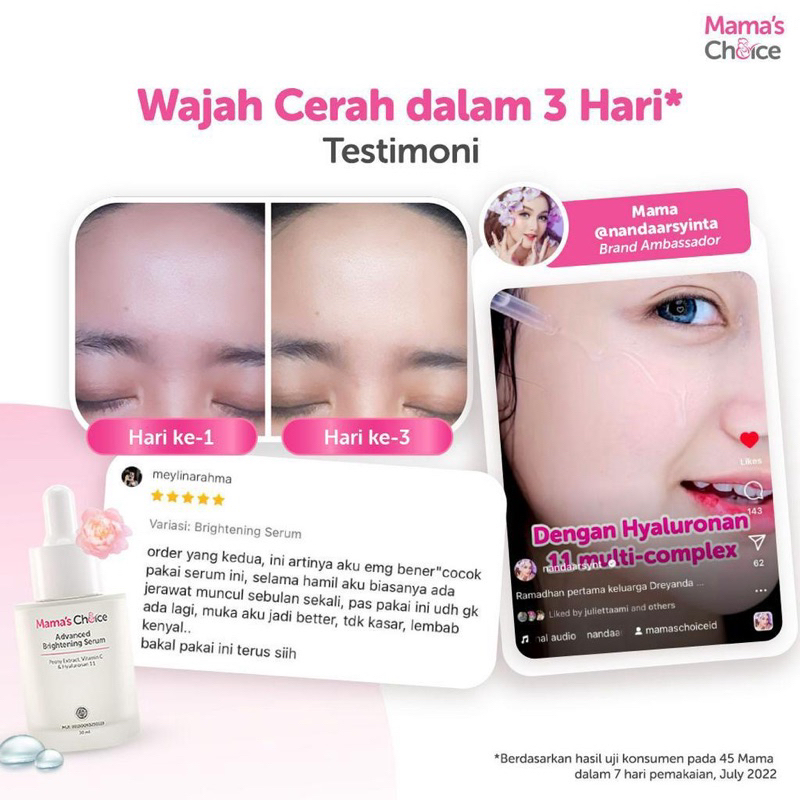 Berdasarkan hasil uji konsumen pada 45 Mama dalam 7 hari pemakaian, Mama’s Choice Advanced Brightening Serum