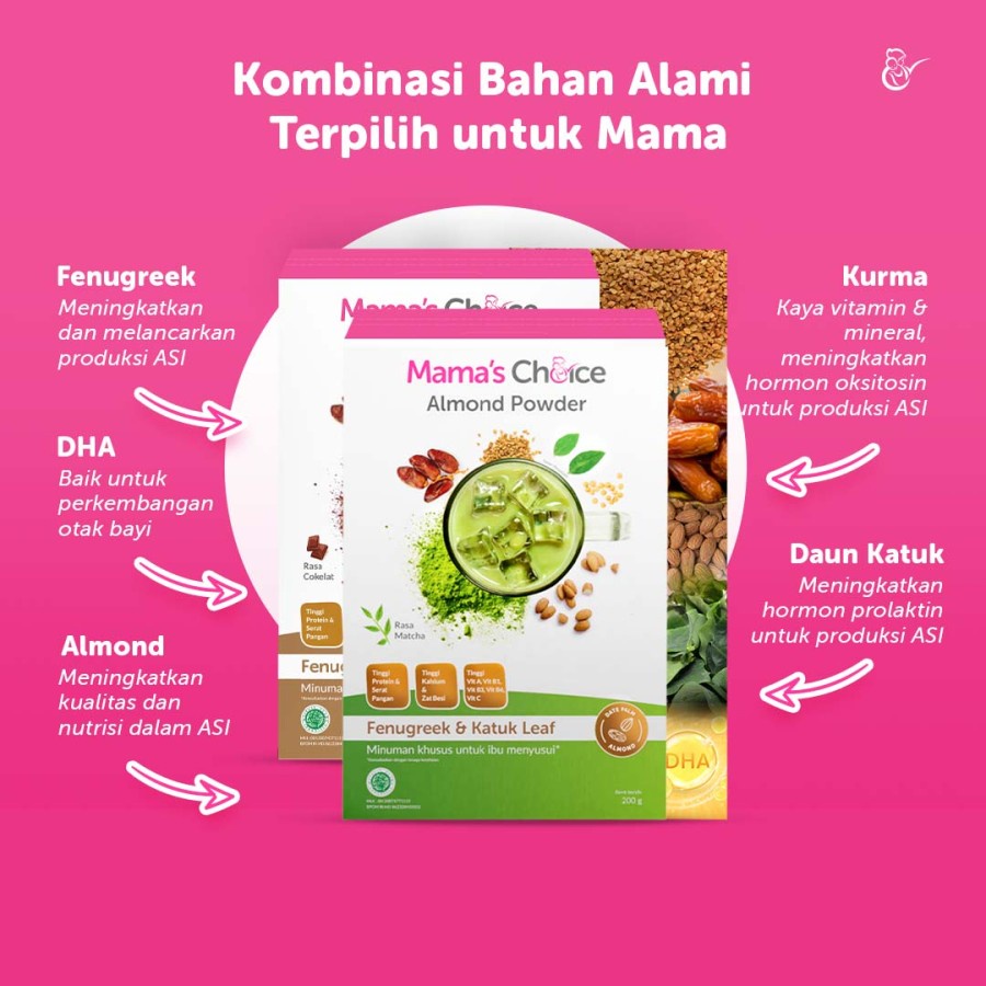 Mama's Choice Almond Milk Powder terbuat dari bahan alami yang teruji klinis mampu meningkatkan produksi dan kualitas ASI + DHA: - Fenugreek Meningkatkan dan melancarkan produksi ASI - DHA Baik untuk perkembangan otak bayi - Almond Meningkatkan kualitas dan nutrisi dalam ASI - Kurma Kaya vitamin & mineral, meningkatkan hormon oksitosin untuk produksi ASI - Daun Katuk Meningkatkan hormon prolaktin untuk produksi ASI
