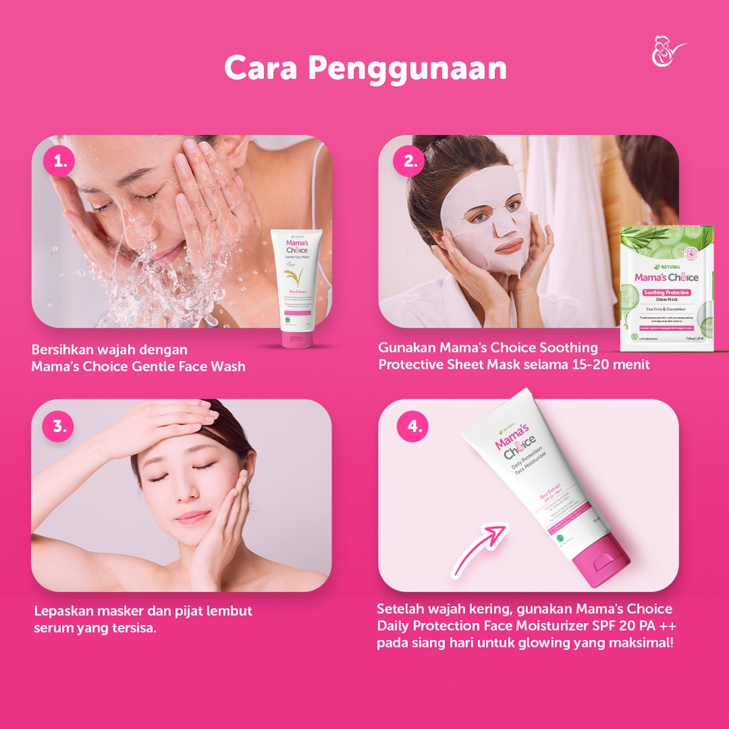Cara pemakaian: 1. Bersihkan wajah dengan Mama’s Choice Gentle Face Wash 2. Lepaskan masker dari kemasan dan sesuaikan masker dengan wajah 3. Gunakan selama 15-20 menit 4. Lepaskan masker dan pijat lembut serum yang tersisa. 5. Setelah wajah kering, gunakan Mama's Choice Daily Protection Face Moisturizer SPF 20 PA ++ untuk glowing yang maksimal. LET'S GLOW