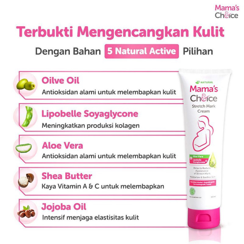 Mama's Choice Stretch Mark Cream diformulasikan khusus untuk ibu hamil dan menyusui. Krim anti-stretch mark ini dapat merawat dan memperbaiki masalah peregangan kulit. Dengan vitamin C, vitamin E dan bahan alami, mampu membuat kulit lebih halus, kencang, dan elastis.