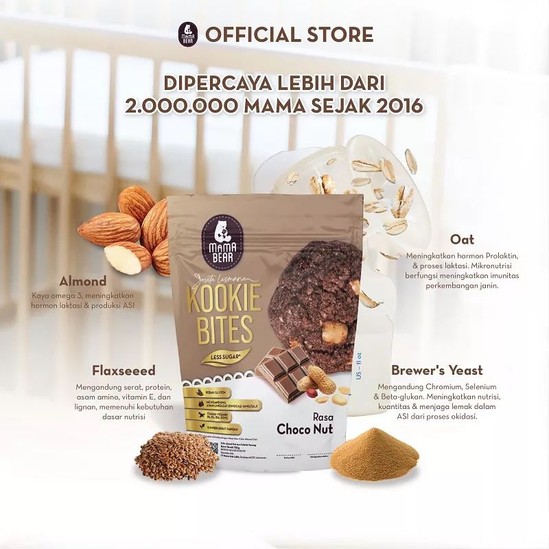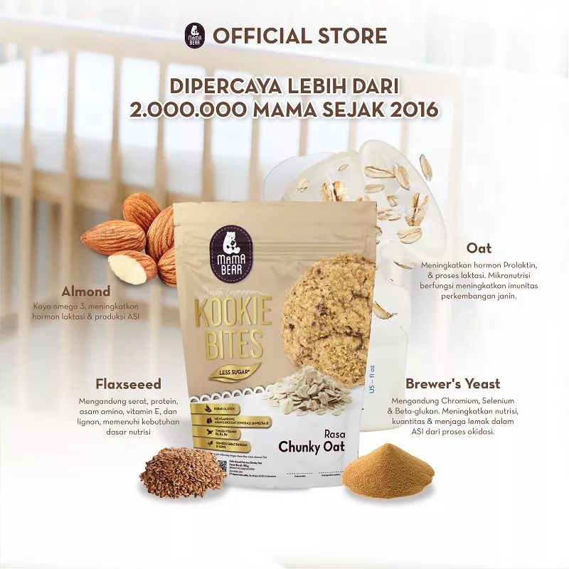 MamaBear X Yovita Kookie Bites terbuat dari bahan almond dan oat asli pilihan dengan segudang kebaikan untuk Mama menyusui. Memberi segala kebaikan untuk Mama selama masa menyusui dengan: