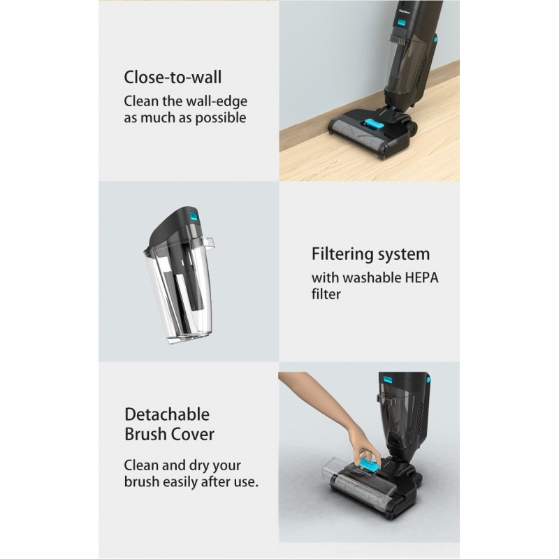 + Pencucian basah dan penyedot debu kering pada saat bersamaan. + Self-cleaning dan charging based terintegrasi. + Tangki air bersih dan air kotor dipisahkan. + Daya hisap yang kuat sampai dengan 13000PA + 4 mode kekuatan motor vacuum + Dirancang tanpa kabel dengan baterai yang dapat dilepas + 20-45 menit waktu penggunaan dalam mode Max/ Eco + Lampu UVC built-in untuk membunuh bateria dan tungau debu. + Cover Roller brush yang dapat dilepas untuk perawatan yang lebih mudah + LED display dengan tampilan digital + Self-driving assistance sebagai tenaga dorong tambahan + Voice alert Fungsi pengingat suara sbb: low battery, tanki air kosong/ penuh, dll + Tangki air bersih up to 1020 ml dan Tangki air kotor up to 1220 ml + Polymer flexible soft velvet rolling brush
