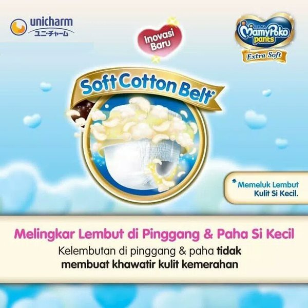 Popok yang lembut di kulit bayi. Dengan Soft Cotton Belt yang lembut di bagian pinggang dan pangkal paha. Kelembutannya pas mengikuti bentuk tubuh si Kecil tanpa meninggalkan bekas kemerahan. Daya serap hingga 12 jam menjaga kulit bayi tetap kering, jadi walaupun pipis berkali-kali namun tidak terasa lembab karena urine terkunci di dalam popok. Permukaannya cepat menyerap sehingga semakin sedikit waktu urine bersentuhan dengan kulit bayi. Bahan sirkulasi udaranya mampu melepaskan lembab dari dalam ke luar. Si kecil bebas beraktifitas sepanjang hari tanpa khawatir kulit kemerahan.