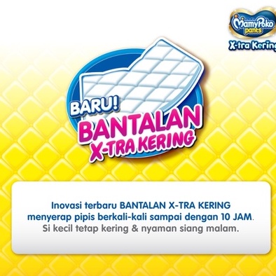 Inovasi Baru: BANTALAN X-TRA KERING Makin hebat dengan inovasi terbaru Bantalan X-tra Kering yang bisa menyerap pipis berkali-kali sampai dengan 10 jam. Si kecil tetap kering dan nyaman siang maupun malam.
