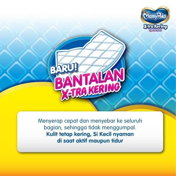 MamyPoko Tipe Perekat Standar/ X-Tra Kering pilihan Mamy untuk menjaga kulit si Kecil tetap kering dan nyaman. Diciptakan dengan lapisan 10 jam daya serap dan 40x gel ekstra serap, sehingga menyerap lebih banyak, lebih cepat kering dan dapat digunakan lebih lama. Mamy pun tenang dan si Kecil merasa nyaman sepanjang hari.