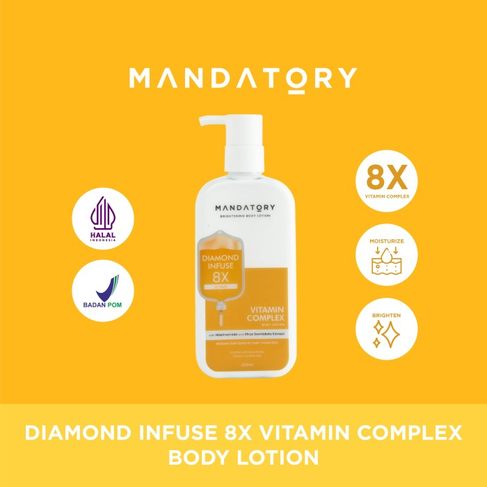 MANDATORY 8X VITAMIN COMPLEX BODY LOTION 8X VITAMIN COMPLEX : like your go-to multivitamin, this is the “multivitamin” for your skin! membantu menutrisi kulit dan memberikan vitamin yang dibutuhkan kulit. NIACINAMIDE : membantu mencerahkan dan mendukung kesehatan kulit RHUS SEMIALATA : tumbuhan yang digunakan untuk obat EXTRACT tradisional Cina ini membantu mengkondisikan kulit.