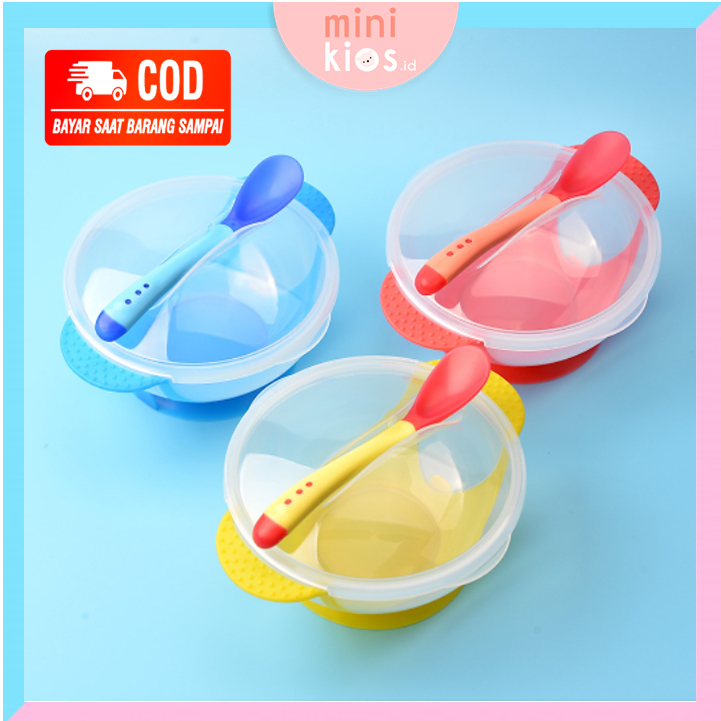 Detail Mangkok + Sendok Makan Bayi Sensor Panas / Mangkuk Tempat Makan Bayi Anti Tumpah - SET MANGKOK MAKAN ANAK BAHAN SILIKON (BPA FREE)