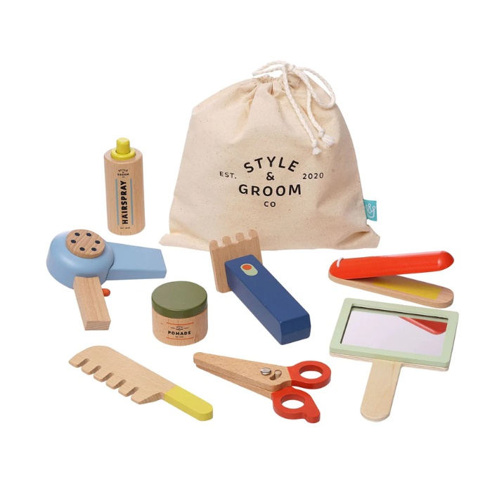 A fresh look awaits with the help of the imaginative Style & Groom wood hair styling set. This nine-piece pretend play set includes one hair dryer, one straightener, one comb, one hair clipper, one handled baby-safe mirror, one pair of scissors - that actually open and close, one pomade jar with removable lid, one hairspray bottle with press-down nozzle and rattle sounds when shaken, plus a fabric drawstring bag for storage. Toddlers and up can imagine their way through barber-shop playtime. Encourages imaginative role-play, cause and effect learning and motor skill development.