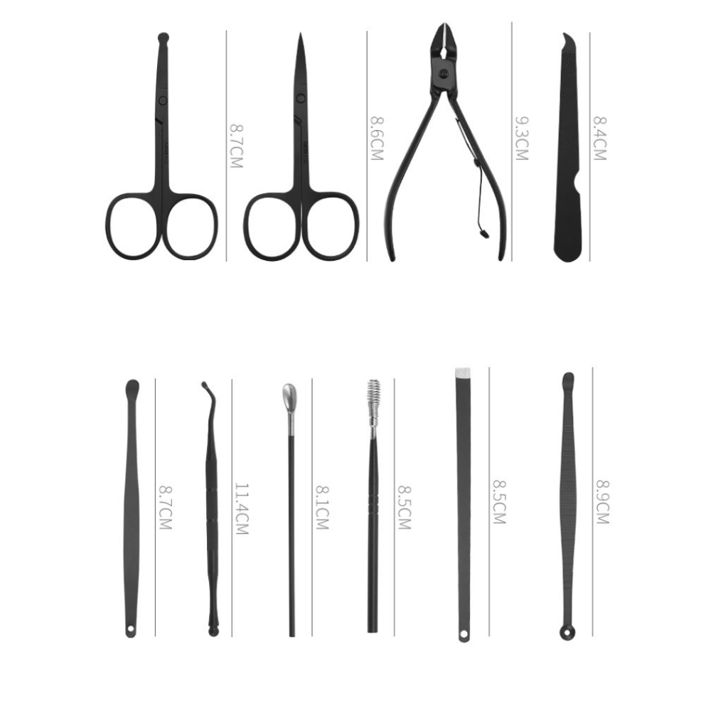 *Gunting Kuku: Potong kuku jari *Gunting Kuku Kaki: Potong kuku kaki yang keras dan tebal *Tang Kutikula: Pangkas kutikula *File Kuku: Buat kuku membulat, halus *Garpu Kulit Mati: Pangkas suface, agnail, kalus, kulit mati, dll *Penjepit: mencabut alis dan rambut yang tumbuh ke dalam *Gunting: potong alis *Pendorong & Pemotong Kutikula: potong keratin kuku dan hapus cat kuku mengikis *Pendorong Pembersih Kuku: Membersihkan kotoran di kuku *Ear Pick: Pembersihan telinga *Jerawat jarum: Komedo/Jerawat menghilangkan *Pedicure Knife (Flat): Membersihkan kulit deak di kaki *Pedicure Knife (Slant): Membersihkan kulit deak di kaki *Pisau pedikur (Menggores): Membersihkan kulit deak di kaki *Sikat Pembersih: Membersihkan alat dan kuku