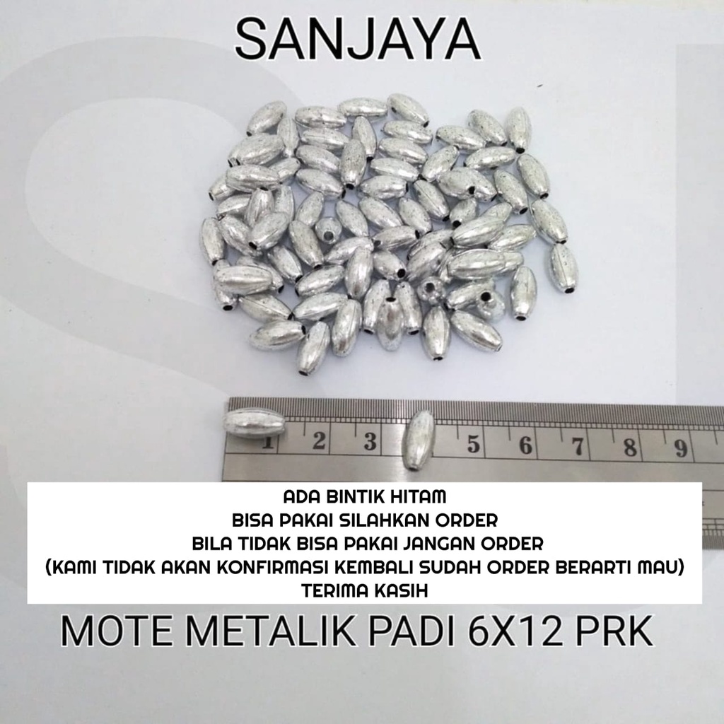 MOTE METALIK PADI 6X12 HANYA ADA 1 WARNA PERAK HARGA YANG TERTERA UNTUK PER 1 BUNGKUS 1 Bks = 1 pon 1 pon berat -+ 450 gram ( Semua manik yang kami jual di timbang , jadi tidak tau isi nya berapa buah )