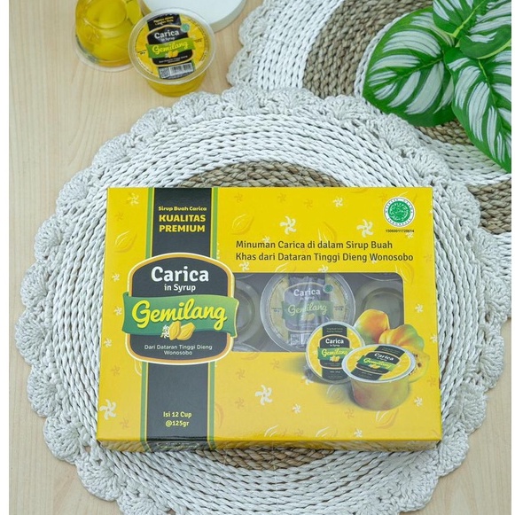 Manisan Carica Gemilang 125 Gr (115 ml) Manisan buah carica, manis alami, buah nya empuk dan menyegarkan Carica bisa disebut juga buah papaya gunung yang tumbuh di daerah Wonosobo, karena tumbuhan ini hanya tumbuh di ketinggian sekitar 1500-3000m dari permukaan laut . Orang orang biasa menyebutnya Carica atau Karika. Banyak orang menyukai manisan carica ini karena manisnya dari gula alami tanpa pemanis buatan, tanpa bahan pengawet, buah carica juga matang di pohon jadi tekstur nya lebih empuk dan tidak keras. Cara menikmati manisan carica ini bisa langsung di makan, di dinginkan dulu dalam lemari es atau bisa juga langsung di tambah es batu. Bahan bahan manisan carica antara lain Buah carica matang Gula Air Manisan Carica 100% Halal 100% Tanpa Bahan Pengawet 100% Tanpa Pemanis buatan 100% Tanpa Pewarna Kimia