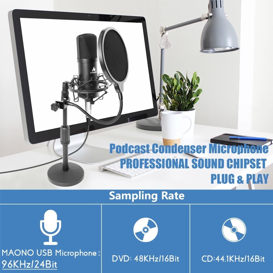 Features : - Large capsule with plated membrane - Cardioid polar pattern - Ultra-low noise circuit design - State of the art surface mount electronics - Stable metal mic stand with pop filter - Compatible with Windows and Mac - Set-up is so easy just connect and go