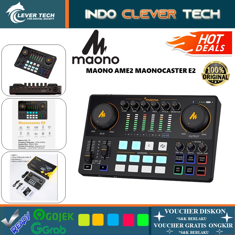 Overview: -Maonocaster E2, a portable all-in-one audio interface with multiple functions including audio effects, mixer control, auto-tune control, loopback, side chain, noise reduction, and more. -Maonocaster E2 is a professional sound card for streaming, podcasting, and recording. -Two mic input interfaces allowing connection with instruments like guitar, and supports background music from audio input via Bluetooth and AUX connection. -2 analog and 1 USB audio output channels allows simultaneous connection with 3 streaming devices. -The powerful built-in audio chip delivers professional studio level audio and provides rich mixing adjustment options. -11 custom buttons for personalized effects setting and unique streaming styles.