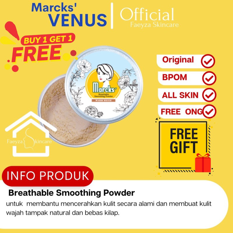 Marcks' Breathable Smoothing Powder merupakan brand extension dari Bedak Marcks'. Merupakan mineral powder yang memiliki tekstur ringan, lembut, dan halus serta diperkaya Licorice Extract untuk membantu mencerahkan kulit secara alami dan membuat kulit wajah tampak natural dan bebas kilap. Mengandung: 1. Licorice Extract yang membantu mencerahkan kulit 2 Alpha Arbutin yang membantu mencerahkan kulit 3. Vitamin E membantu menjaga kelembaban kulit 4. Green Tea Extract sebagai antioksidan yang melindungi kulit.