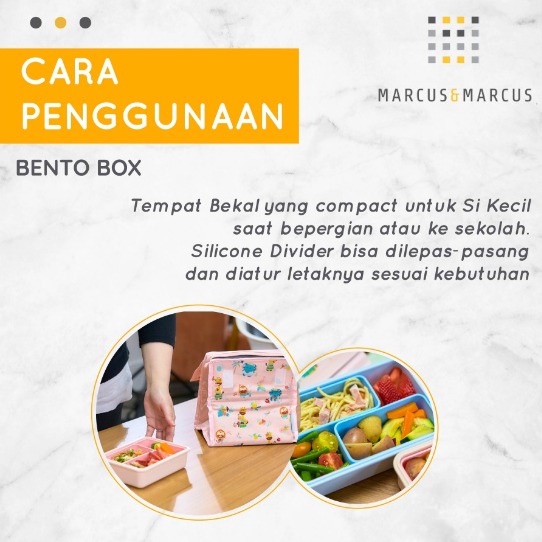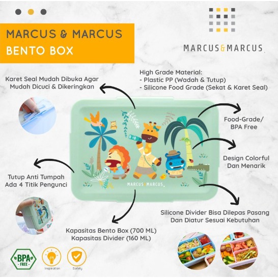 Spesifikasi produk Marcus&Marcus: BPA/Phthalate Free Microwave Safe Dishwasher Safe Freezer Safe High Grade Material: Plastic PP (Wadah & Tutup), Silicone Food Grade (Karet Seal & Silicone Bento Box Divider) Aman pada temperatur -20°C sampai 110°C untuk Tutup & Wadah Bento Box Aman pada temperatur -20°C sampai 220°C untuk Karet Seal & Silicone Divider