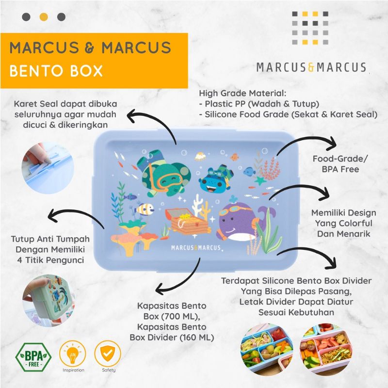 Tempat bekal yang compact, sempurna untuk Si Kecil membawa bekal yang sehat saat bepergian atau ke sekolah. Terdapat Silicone Bento Box Divider yang bisa dilepas-pasang, letak divider dapat diatur sesuai dengan kebutuhan. Tutup Anti Tumpah dengan memiliki 4 titik penguncian. Karet Seal dapat dibuka seluruhnya agar mudah dicuci & dikeringkan Dapat disimpan dengan rapih secara tertumpuk, hemat ruang penyimpanan