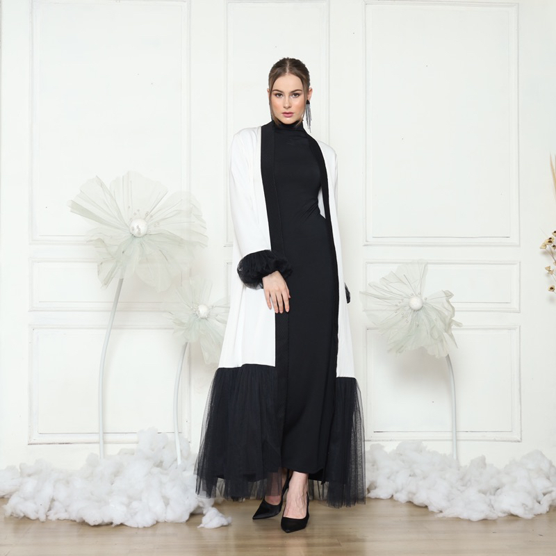 Long Outer •Berbahan crepe silk putih, detail puffed sleeves berbahan tulle pada rempel dan kombinasi cotton jacquard pada list •Full furing