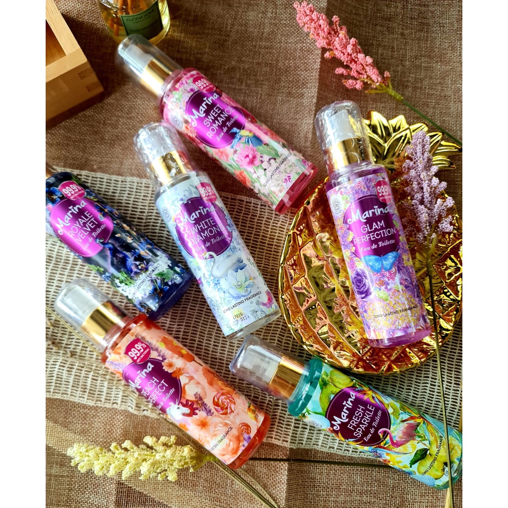 Marina EDT parfum edu toilet 150 ML memiliki variant yang bervariasi sesuai selera anda memiliki 6 variant keharuman yang dapat anda pilih sesuai selera anda Untuk Best Seller : 1. Royal Velvet 2. Fresh Sparkle 3. White Diamond untuk variant fresh sparkel menggunakan kemasan baru yang variant lain masih kemasan lama.... kemasan baru : Fresh Sparkel