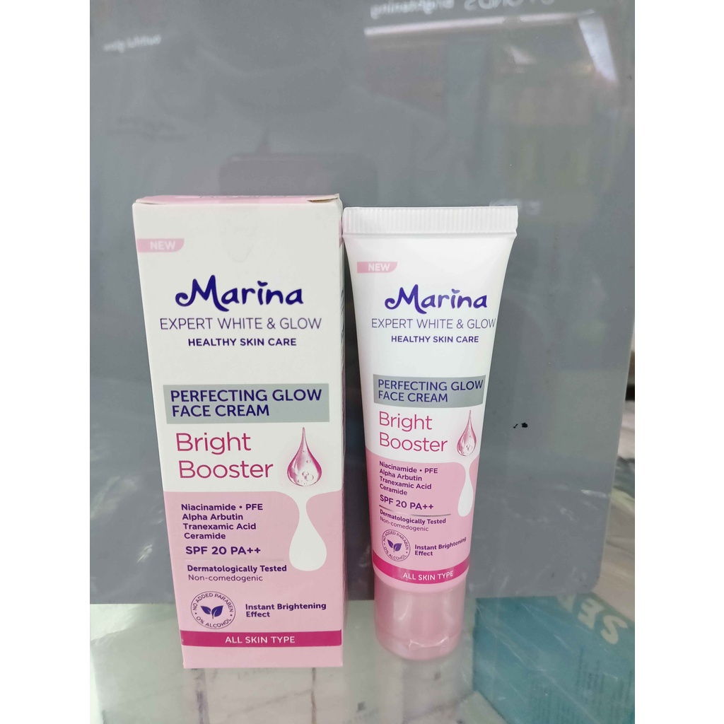Marina Expert White And Glow Perfecting Glow Face Cream (Bright Booster) Perfecting glow face cream dengan tekstur ringan memberikan efek make up untuk kulit wajah cerah seketika, serta SPF 20 PA++ yang melindungi kulit dari efek buruk sinar UVA dan UVB. Dengan Advanced Bright Radiance secara optimum mencerahkan wajah dan menyamarkan tampilan noda hitam. Kulit sehat, tampak lebih cerah natural dan glowing. Dengan kandungan sebagai berikut : *Niacinamide yang dapat membantu menjada fungsi barrier kulit dan mencerahkan kulit. *PFE (Pseudoalteromonas Ferment Extract) yang melindungi kulit dengan menjaga kelembabannya *Alpha arbutin dan Tranexamic Acid membantu mencerahkan kulit dan menyamarkan tampilan noda hitam *Ceramide-2 membantu menjaga fungsi barrier kulit, melembabkan, menjaga elastisitas kulit *Licorice yang membantu mencerahkan dan meratakan warna kulit