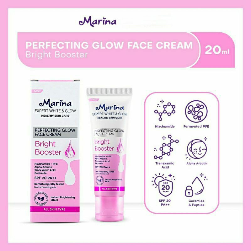 Marina Expert White And Glow Perfecting Glow Face Cream (Bright Booster) Perfecting glow face cream dengan tekstur ringan memberikan efek make up untuk kulit wajah cerah seketika, serta SPF 20 PA++ yang melindungi kulit dari efek buruk sinar UVA dan UVB. Dengan Advanced Bright Radiance secara optimum mencerahkan wajah dan menyamarkan tampilan noda hitam. Kulit sehat, tampak lebih cerah natural dan glowing. Dengan kandungan sebagai berikut : *Niacinamide yang dapat membantu menjada fungsi barrier kulit dan mencerahkan kulit. *PFE (Pseudoalteromonas Ferment Extract) yang melindungi kulit dengan menjaga kelembabannya *Alpha arbutin dan Tranexamic Acid membantu mencerahkan kulit dan menyamarkan tampilan noda hitam *Ceramide-2 membantu menjaga fungsi barrier kulit, melembabkan, menjaga elastisitas kulit *Licorice yang membantu mencerahkan dan meratakan warna kulit