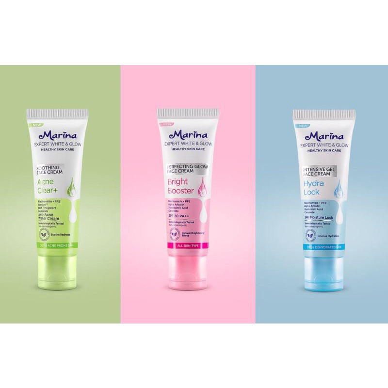 Marina Expert White And Glow Sooting Face Cream (Acne Clear) Pelembab wajah water based yang tidak lengket, mudah meresap dengan sensasi cooling. Dengan Advanced Bright Anti Acne secara optimum membantu mencerahkan wajah, menyamarkan noda hitam, bekas jerawat, serta memberi hidrasi tanpa rasa berminyak dan menenangkan kulit. Kulit sehat bersinar, cerah, dan teraa halus. Dengan kandungan sebagai berikut : *Niacinamide yang membantu menjaga fungsi barrier kulit dan mencerahkan kulit. *PFE (Pseudoalteromonas Ferment Extract) yang melindungi kulit dengan menjaga kelembabannya *AzeclairTM yang membantu menguraangi tampilan minyak berlebih dan merawat kulit berjerawat *BHA dan Mugwort yang melindungi dari bakteri bakteri penyebab jerawat, menyamarkan tampilan pori, serta menenangkan kemerahan pada kulit.