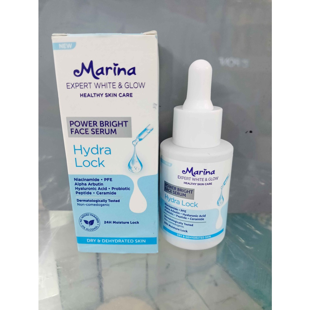 Marina Expert White And Glow Power Bright Face Serum (Hydra Lock) Serum bertekstur ringan dan mudah meresap yang menutrisi kulit dengan Power Bright Hydrating, terbukti secara optimum membantu mencerahkan wajah, menyamarkan noda hitam dalam 7 hari, serta mengunci kelembaban hingga 24 jam. Dengan pemakaian teratur, kulit tampak cerah, terasa kenyal dan lembap. *Niacinamide yang membantu menjaga fungsi barrier kulit dan mencerahkan kulit *PFE (Pseudoalteromonas Ferment Extract) yang membantu regenerasi kulit dan menjaga kelembaban kulit *Alpha Arbutin membantu mencerahkan kulit dan menyamarkan tampilan noda hitam *Hyaluronic Acid dan Probiotic yang memberikan hidrasi intens, menjaga kelembaban, kehalusan dan kesehatan kulit *Peptide dan Ceramide-2 yang membantu menjaga fungsi barrier kulit, melembabkan dan menjaga elastisitas kulit