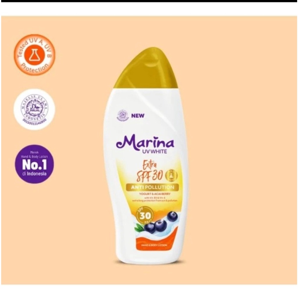 Memberikan 2x Perlindungan Extra untuk Kulit Tampak Putih Tahan Lebih Lama Marina UV White extra SPF 30 Hand & Body Lotion dengan SPF 30 sebagai UV B Protection melindungi dari paparan sinar matahari lebih lama dan PA++ sebagai UV A Protection membantu menghambat penggelapan kulit. Mengandung Bio Whitening Complex paduan Vitamin B3 & E, serta Yogurt dan Superfruit Acai Berry yang kaya antioksidan bantu cerahkan kulit sehingga tampak lebih putih merata. Formulanya meresap dan tidak lengket. Sesuai untuk perlindungan sehari-hari. Marina UV White Extra SPF 30 Hand & Body Lotion teruji klinis memberi perlindungan optimal dari sinar UV A dan UV B.