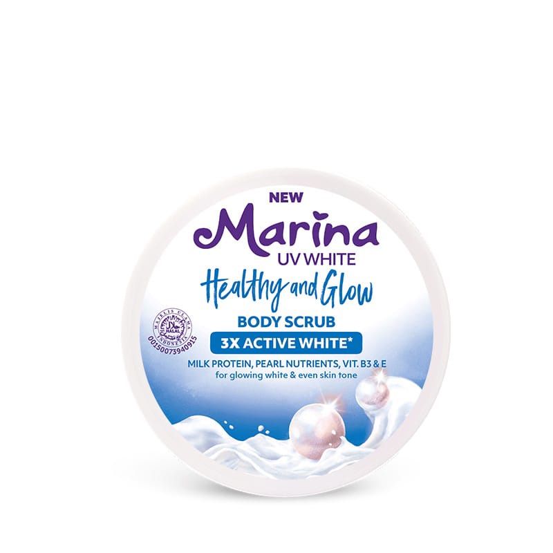 Terdiri dari 2 varian : 1. Marina Healthy & Glow Body Scrub Body scrub dengan butiran scrub lembut dan jumlah lebih banyak yang dapat mengangkat kotoran & sel kulit mati. Diformulasikan khusus dengan Bio Whitening Complex paduan Vitamin B3 & E serta Milk Protein dan Pearl Nutrient untuk kulit bersih, halus, cerah & sehat berkilau. 1) Body Scrub Untuk Kulit Bersih, Halus & Cerah 2) Butiran scrub lembut dan jumlah lebih banyak 3) Biowhitening Complex paduan Vitamin B3 & E, Milk Protein dan Pearl Nutrient