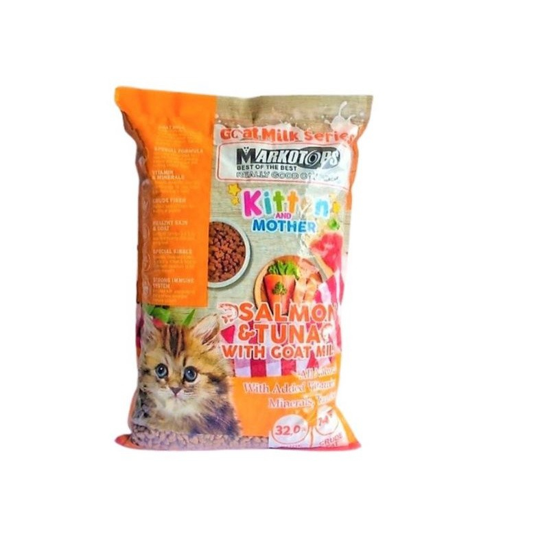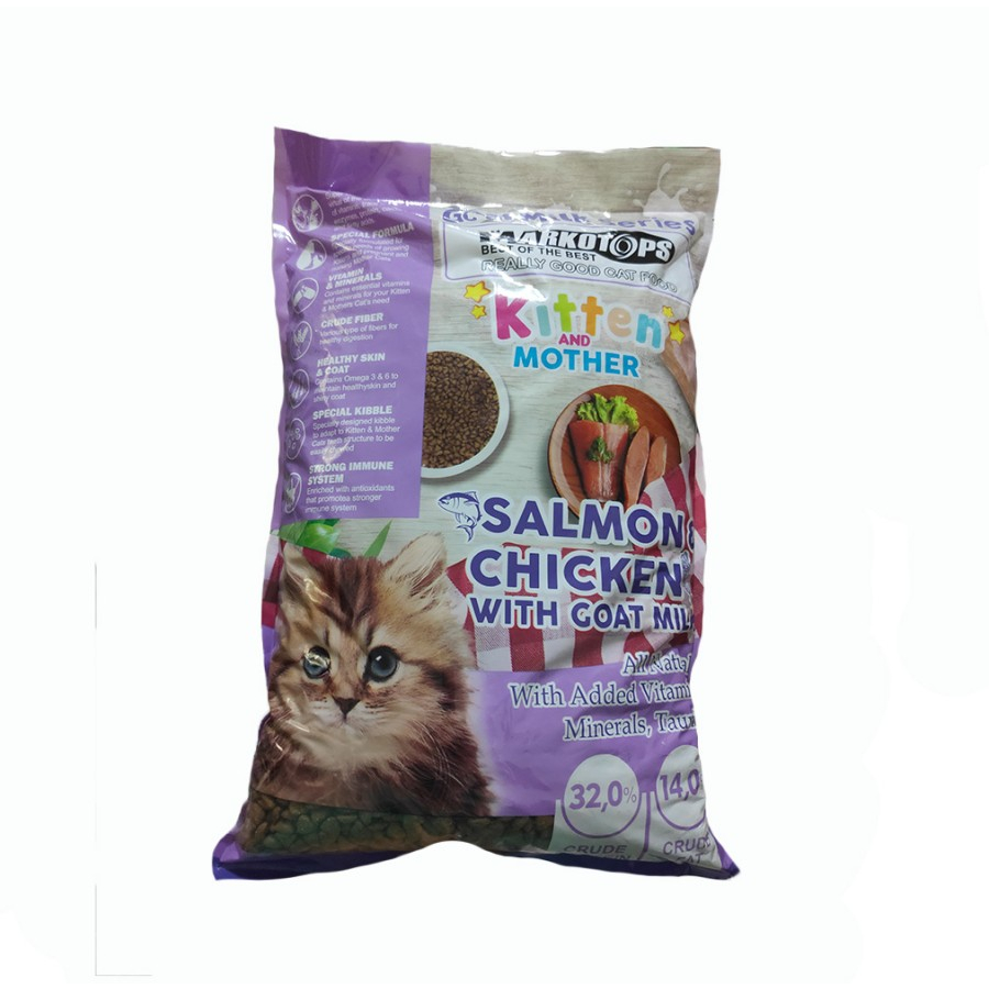 Makanan kucing markotops kitten and mother, rasa salmon & chicken dengan tambahan goat milk/susu kambing