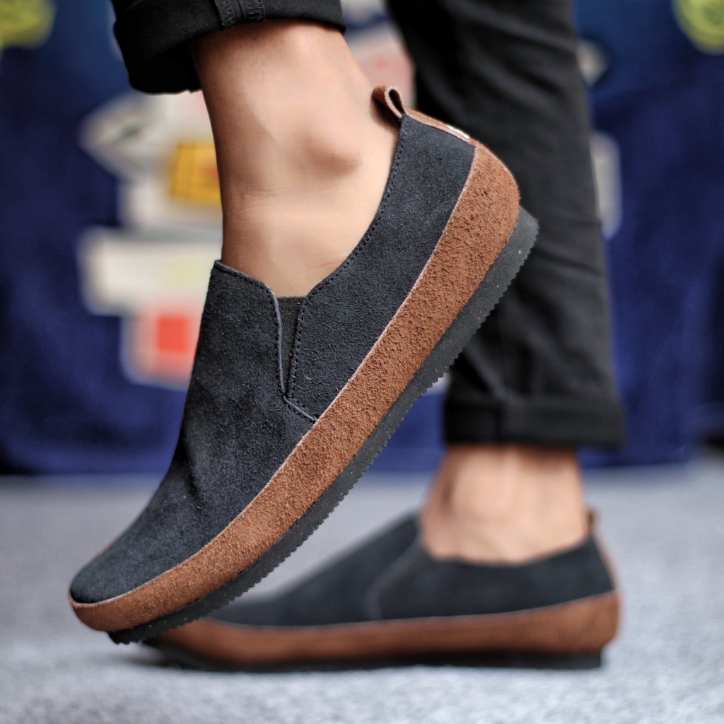 Detail MARO Sepatu Casual Slop Pria HItam Kulit Asli Suede Slip On Cowok Trendy Murah