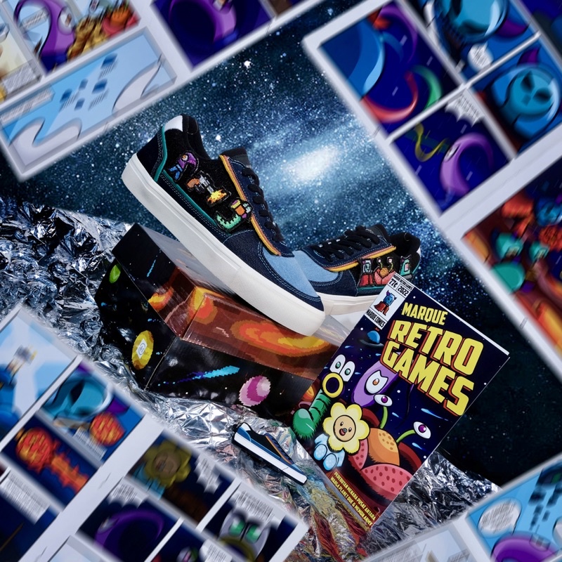 Detail MARQUE RETRO GAMES vol 2.0 - Sepatu dengan Konsep Outer Space Arcade, dengan 6 Patch, Packaging yang Unik, Gratis Komik dan Gantungan Kunci Rubber, dengan Polyurethane Insole Empuk, untuk Pria & Wanita, Sneakers bisa untuk Couple/Kembaran, Gambar Alien