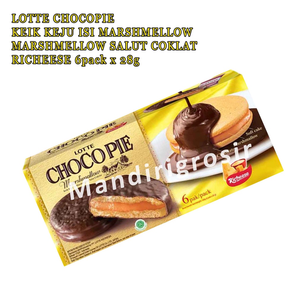 KAMI MENYEDIAKAN KEMASAN TAMBAHAN . KARNA JIKA TIDAK MENGGUNAKANYA KAMI TIDAK AKAN TANGGUNG JAWAB ATAS KERUSAKAN BARANG DALAM PERJALANAN. MEMBELI BERARTI SETUJU LINK: https://shopee.co.id/BUBBLE-WRAP-DAN-KARDUS-BOX-TAMBAHAN-i.244553760.3360221083 * Lebih banyak lebih bagus lebih murah ---Mandiri grosir * Marshmellow Richeese * Lotte Chocopie Marshmellow * Keik Keju Salut Coklat * Isi 6 pack Choco Pie Marshmallow Richeese adalah kue lembut yang ideal untuk menemani waktu santai atau kumpul bersama teman dan keluarga tercinta. Merupakan perpaduan soft cake, marshmallow rasa keju dan krim cokelat yang lembut. Perpaduan manis coklat dan cream serta lembutnya kue menghadirkan sensasi yang istimewa di dalam mulut anda