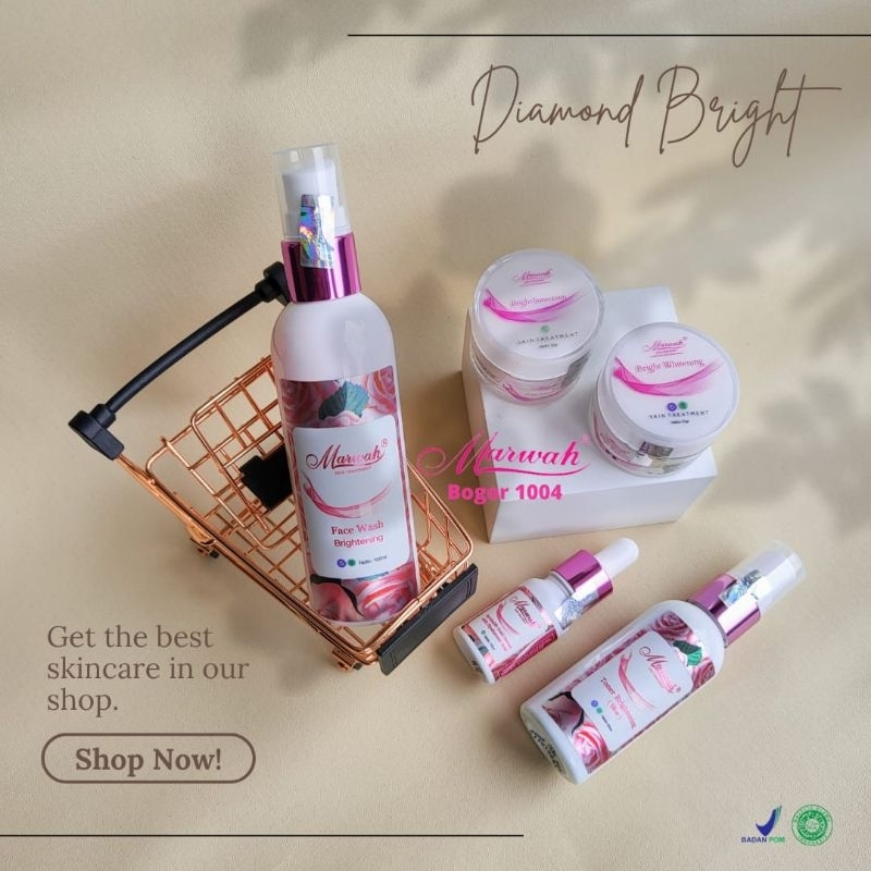MARWAH Jenis Paket : 1. Diamond Bright = kulit normal tanpa jerawat/flek 2. Bright Teatree = untuk kulit normal yg sdikit berminyak, jerawat ketika pms 3. Platinum = normal, memutihkan lebih cepat 4. Aging = untuk Flek ringan/bekas jerawat 5. Aging Teatree = kulit yg berminyak, ada bekas jerawat/flek ringan 6. Anti Aging Spesial = flek berat/membandel (bertahun-tahun) 7. Diamond Oily = yg berminyak parah, jerawat ketika mens 8. Diamond Acne = jerawat ringan 9. Derma Acne = jerawat meradang/batu 10. MEN = khusus Pria (semua jenis kulit)
