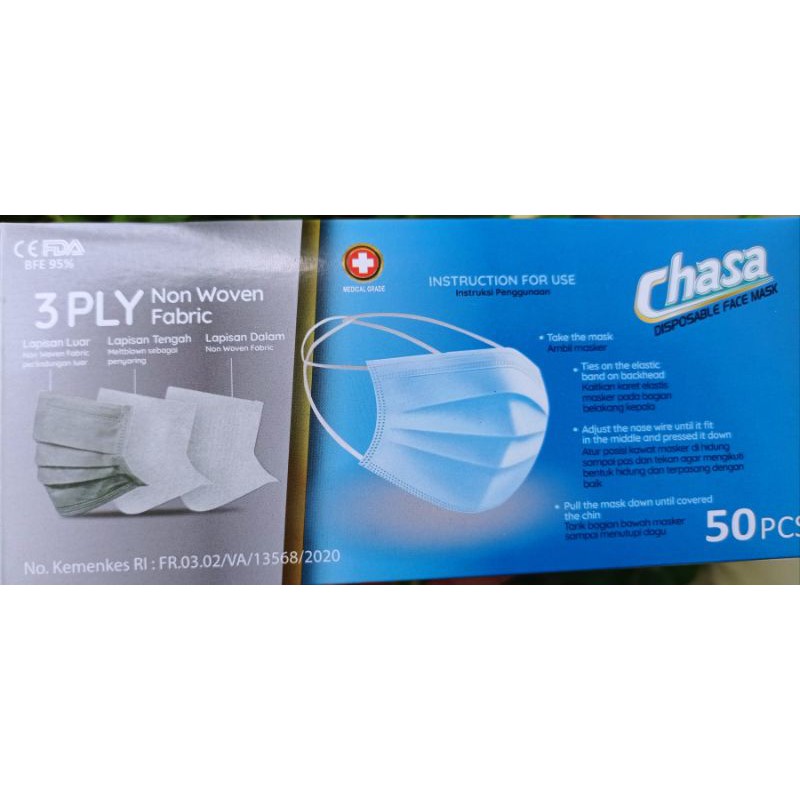 Warna : Biru Merk : Chasa Type : Headloop Harga : Per box Box : Include size : 17,5cm x 9,5cm material : non-woven 70% + melt-blown 30% cust : 3ply qty pack : 50pc batch : 20200801 production date : Nov 2020 validity date : 2 years