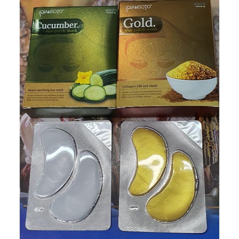 masker mata qiansoto gold terdapat kandungan alami pada kolagen fungsiny untuk mengencangkan dan melembabkan kulit d bagian bawah mata sedangkan yg cucumber mengandung vit A,B2danC membantu mengecilkan melamin gelapyg ada d sekitar mata.