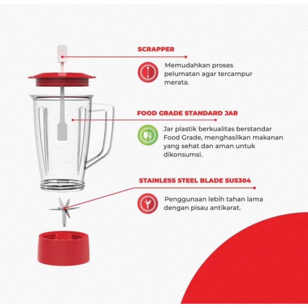 Deskripsi Maspion Blender MT-1261 PL Maspion MT-1262-PL - Blender Plastik 1 Liter 2in1 230 Watt memberikan pilihan terbaik bagi Bunda untuk menghaluskan buah, adonan hingga bumbu kering. Terdapat tombol on dan off yang mempermudah penggunaan blender. Spesifikasi: - Jenis produk: blender 1 fungsi (TANPA MILL) - Daya listrik: 230 W