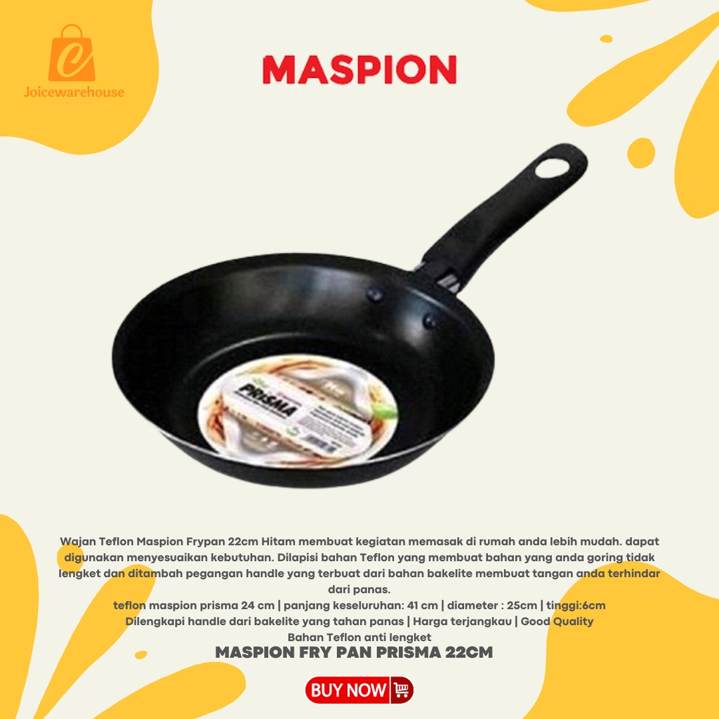 Wajan Teflon Maspion Frypan 22cm Hitam membuat kegiatan memasak di rumah anda lebih mudah. dapat digunakan menyesuaikan kebutuhan. Dilapisi bahan Teflon yang membuat bahan yang anda goring tidak lengket dan ditambah pegangan handle yang terbuat dari bahan bakelite membuat tangan anda terhindar dari panas. teflon maspion prisma 24 cm panjang keseluruhan: 41 cm diameter : 25cm tinggi:6cm Dilengkapi handle dari bakelite yang tahan panas Harga terjangkau Good Quality Bahan Teflon anti lengket