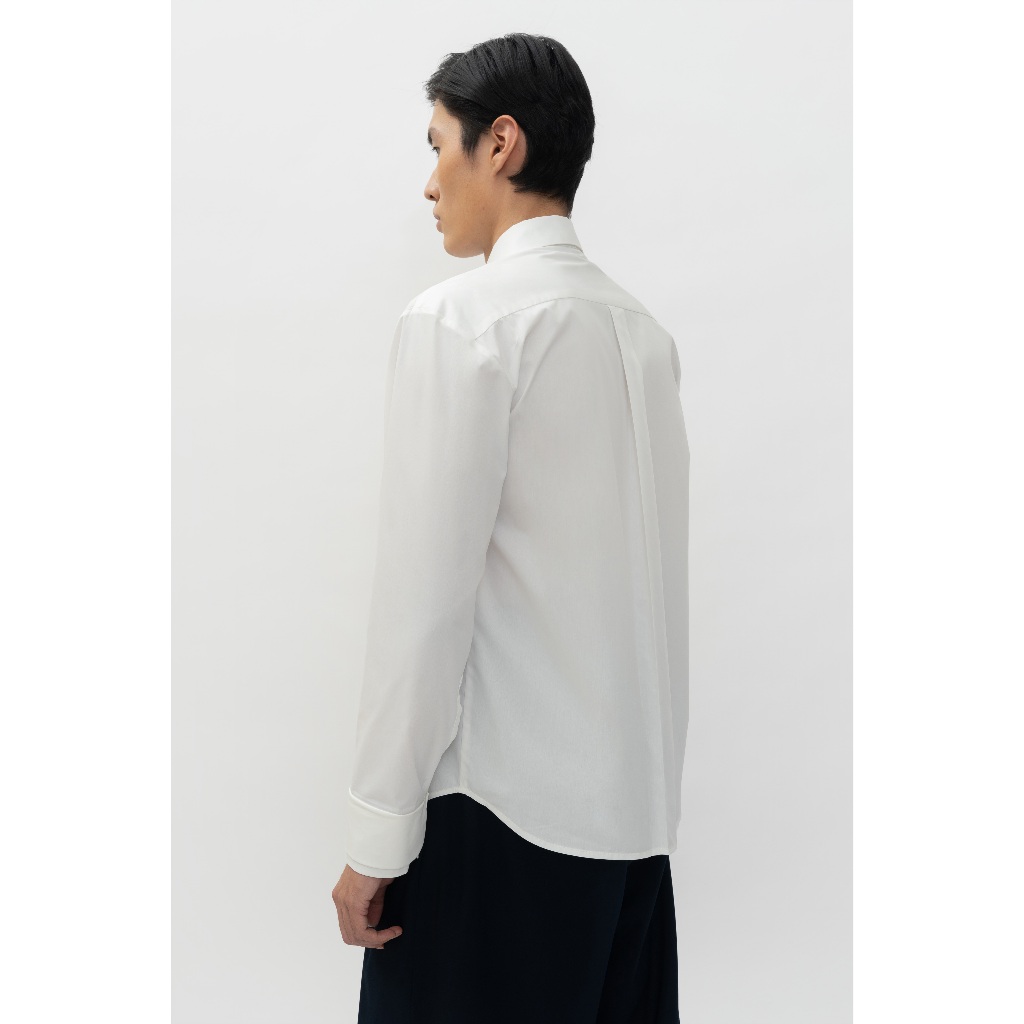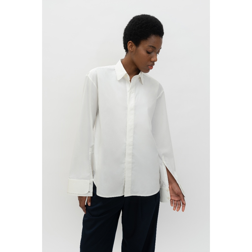 DETAILS Oversized fit long sleeve menswear cut shirt with rounded collar flaps, hidden placket and large extended sleeve cuff panel for adjustable sleeve styling options.