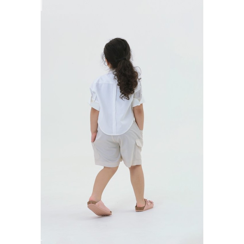 DETAILS Girls' shirts are distinguished by a unique double collar stand design. Featuring three-quarter length sleeves, complemented by a back yoke and a secured box pleat on the back bodice for an enhanced aesthetic. The foldable extended cuffs add a touch of versatility to the overall design.