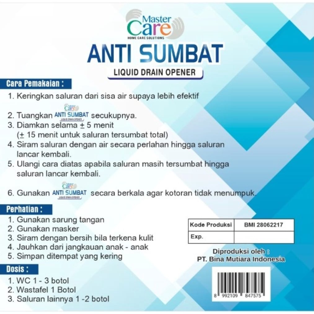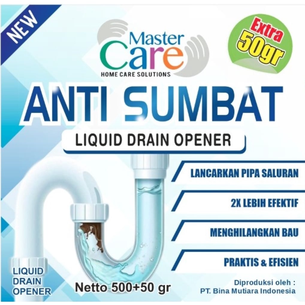 MASTER CARE ANTI SUMBAT CAIR Kemasan : 500 gram extra 50 gram = 550 gram 1. Bekerja dengan cepat hanya dalam hitungan menit 2. Mengatasi mampet akibat sumbatan makanan, sisa lemak makanan, kertas, kain , rambut hancur menjadi abu 3. Bisa digunakan pada kloset kamar mandi, wastafel, bak cuci piring, saluran pipa, saluran pipa, dll 4. Aman dan tidak merusak pipa pvc. Jangan digunakan untuk selang bak cuci piring yg tipis ya.