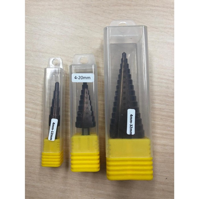 Deskripsi Mata Bor Multi Step Drill Pagoda 4-32 mm BAHAN TCT Step Drill / Mata Bor Susun bentuk pagoda metric spiral flute, membuat lubang 4-32 mm bahan TCT COBALT dengan center punch.